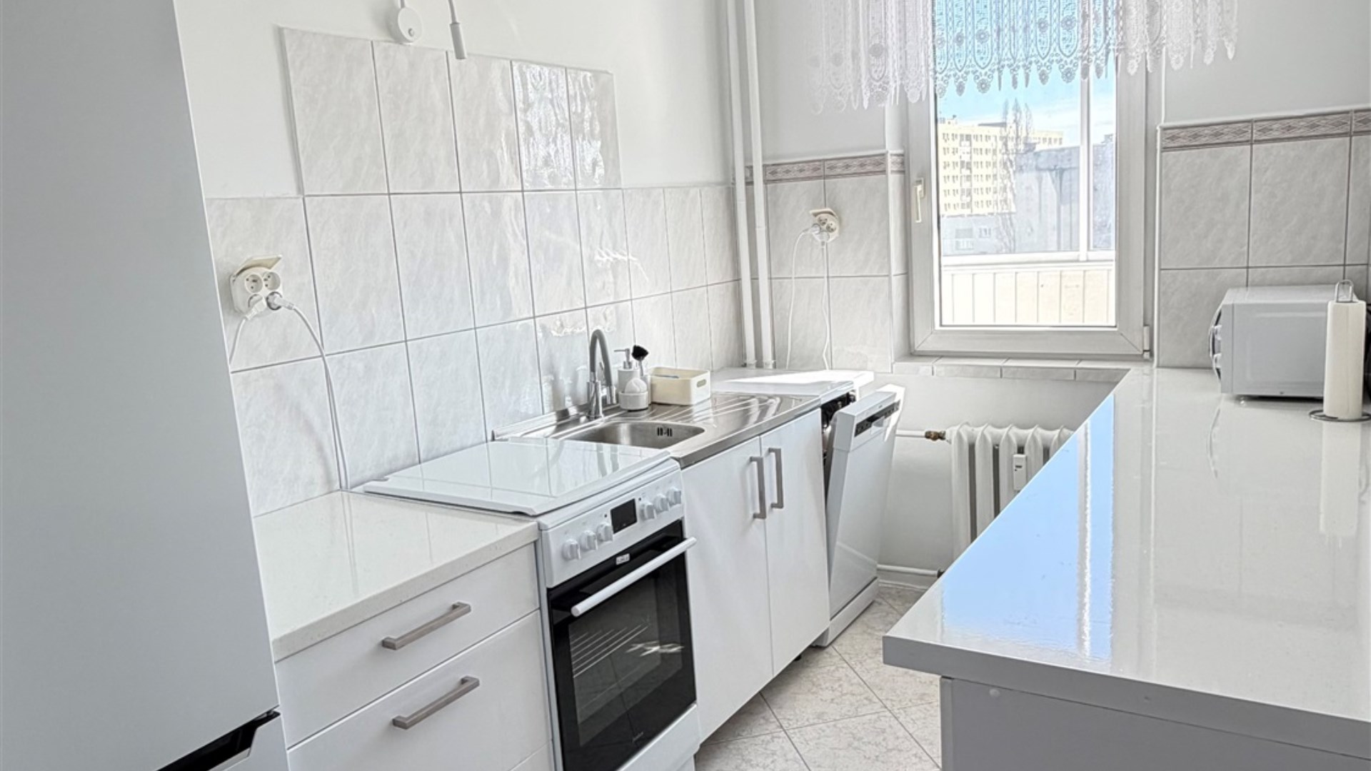 Mieszkanie składa się z przestronnego, klimatyzowanego pokoju dziennego z wyjściem na balkon, dużej sypialni, oddzielnej widnej kuchni, łazienki z dużą kabiną prysznicową oraz przedpokoju z szafą wnękową.