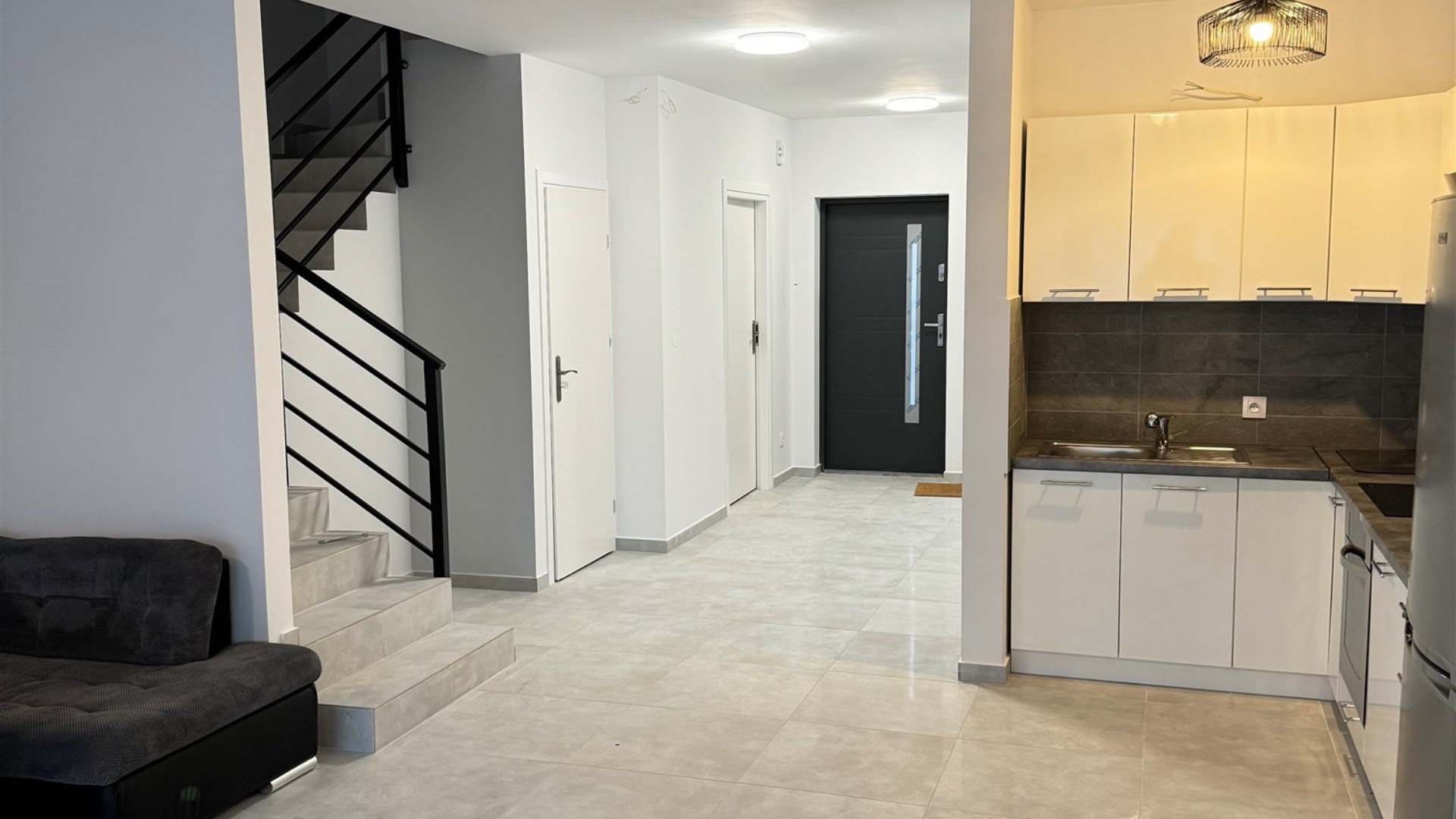 Salon z aneksem kuchennym, 4 sypialnie, 2 łazienki (wanna i kabina prysznicowa), garaż z bramą na pilota.